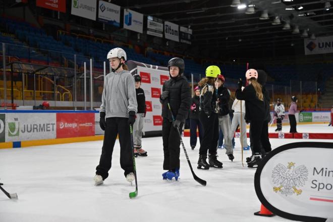 Nie brakowało emocji ani sportowej rywalizacji. Mini mecze, ćwiczenia dryblingu, strzały na celność i kontrola krążka pozwalały dzieciom w praktyce wykorzystać zdobyte umiejętności. Równolegle działała strefa poza lodowiskiem, w której uczestnicy mogli trenować operowanie kijem. Punktem kulminacyjnym był pokazowy mecz MKS SOKOŁY TORUŃ, który stanowił doskonałą inspirację dla najmłodszych i pokazał, jak wiele radości daje hokej w praktyce.